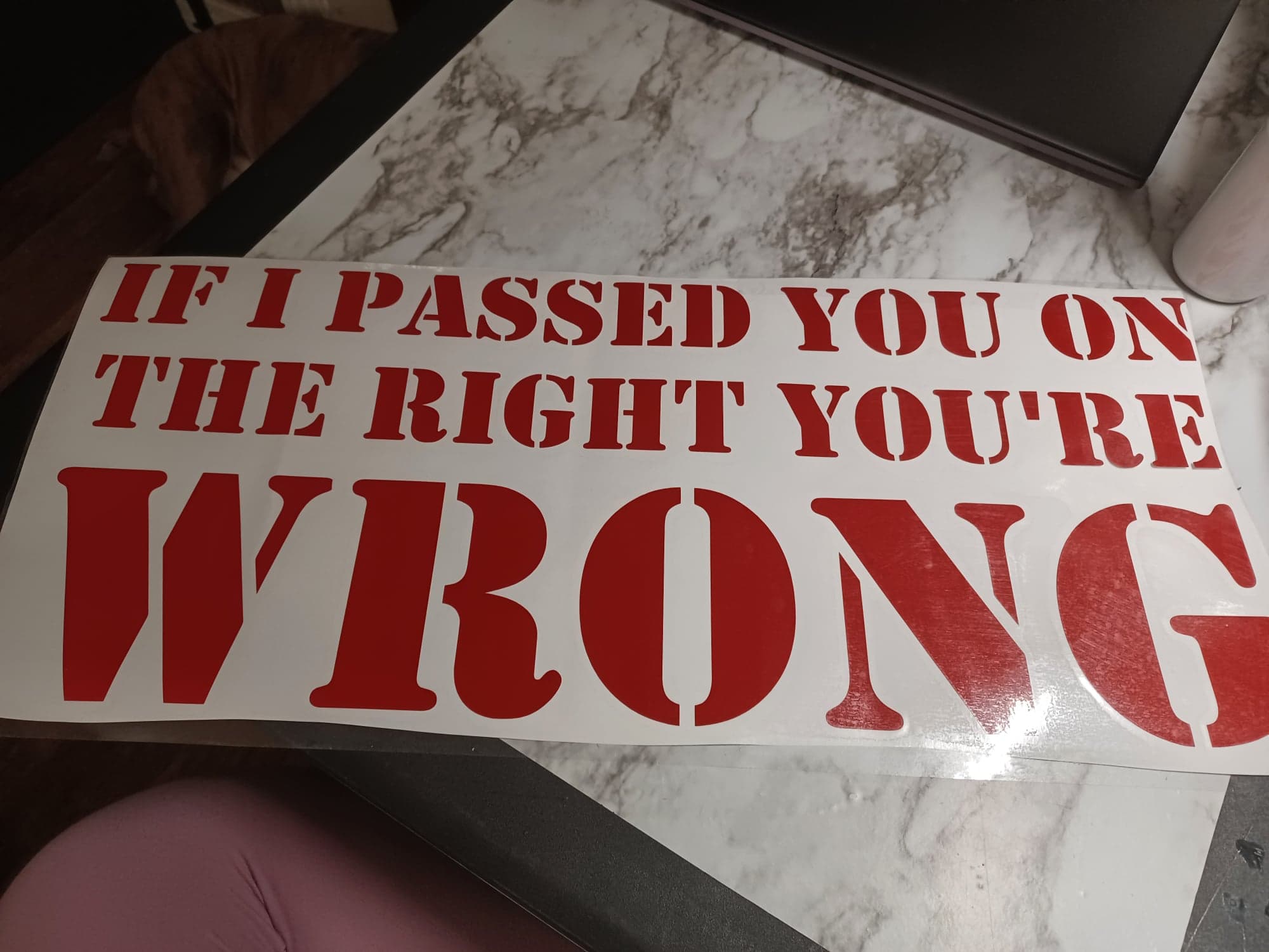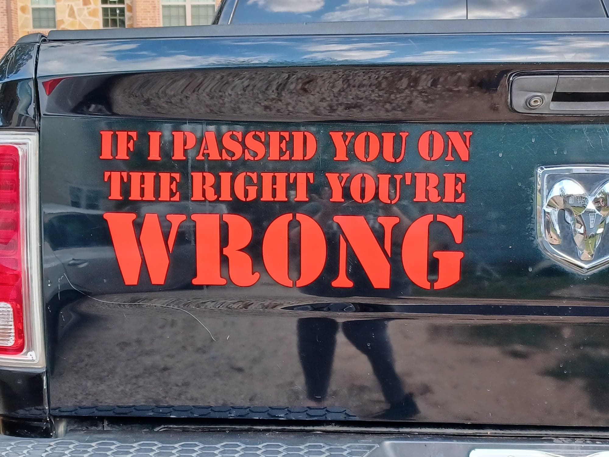 Add some humor to your vehicle with our "IF I PASSED YOU ON THE RIGHT YOU'RE WRONG" decal. Perfect for showing off your personality and sense of humor while on the road. Easy to apply and made with durable material for long-lasting enjoyment.